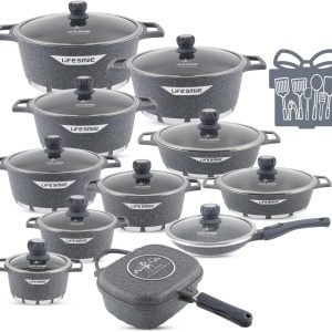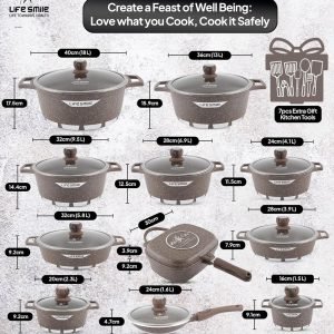 Big Summer Sale Limited Time Offer RM 9.9:LIFE SMILE Cookware Set Granite Stone 29 Pieces – Pots and Pans set Multi Layer Granite Non Stick Coating Cookware Sets 100% PFOA FREE,Complete Kitchenware Cooking Sets and Frying Pans